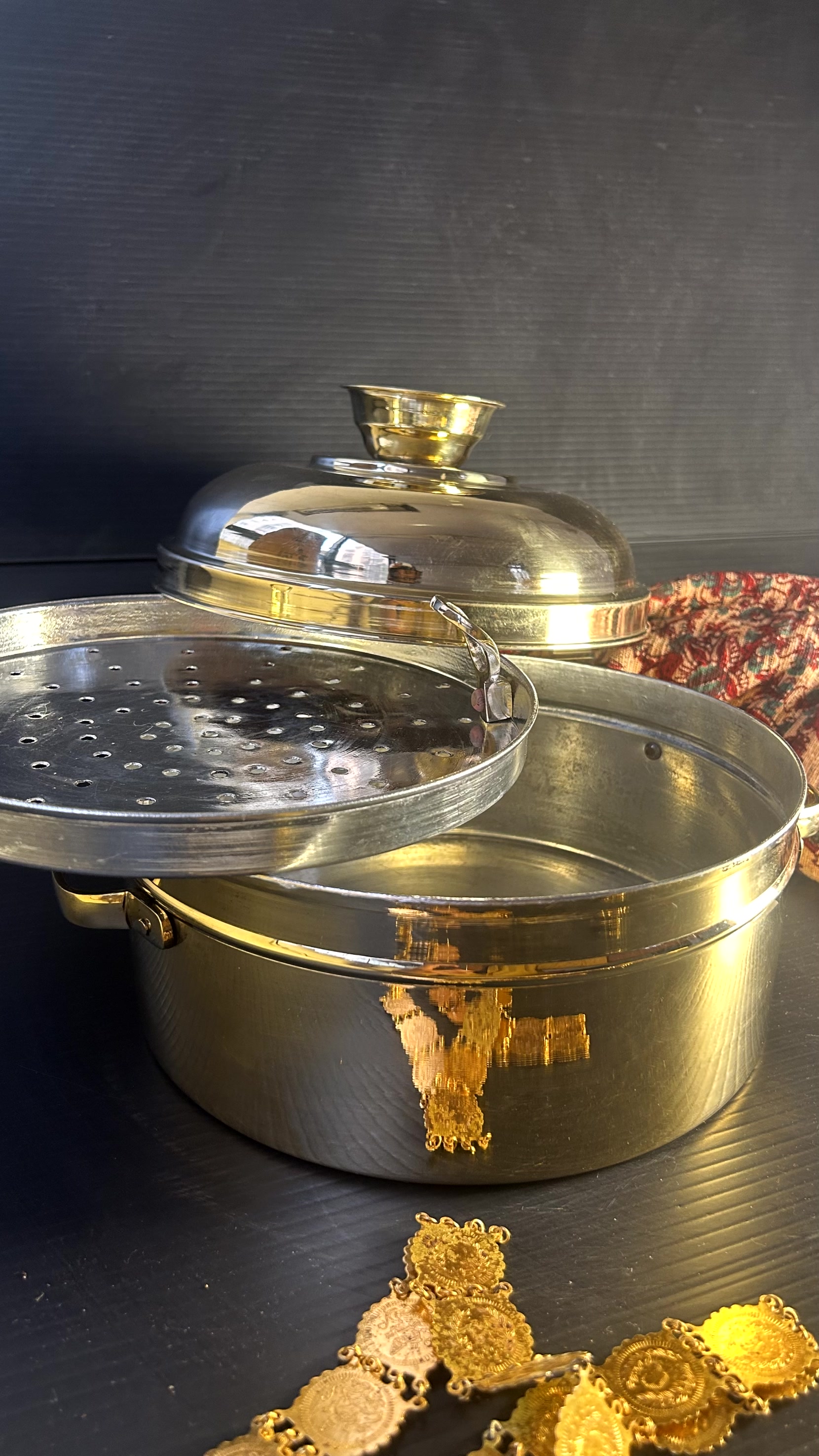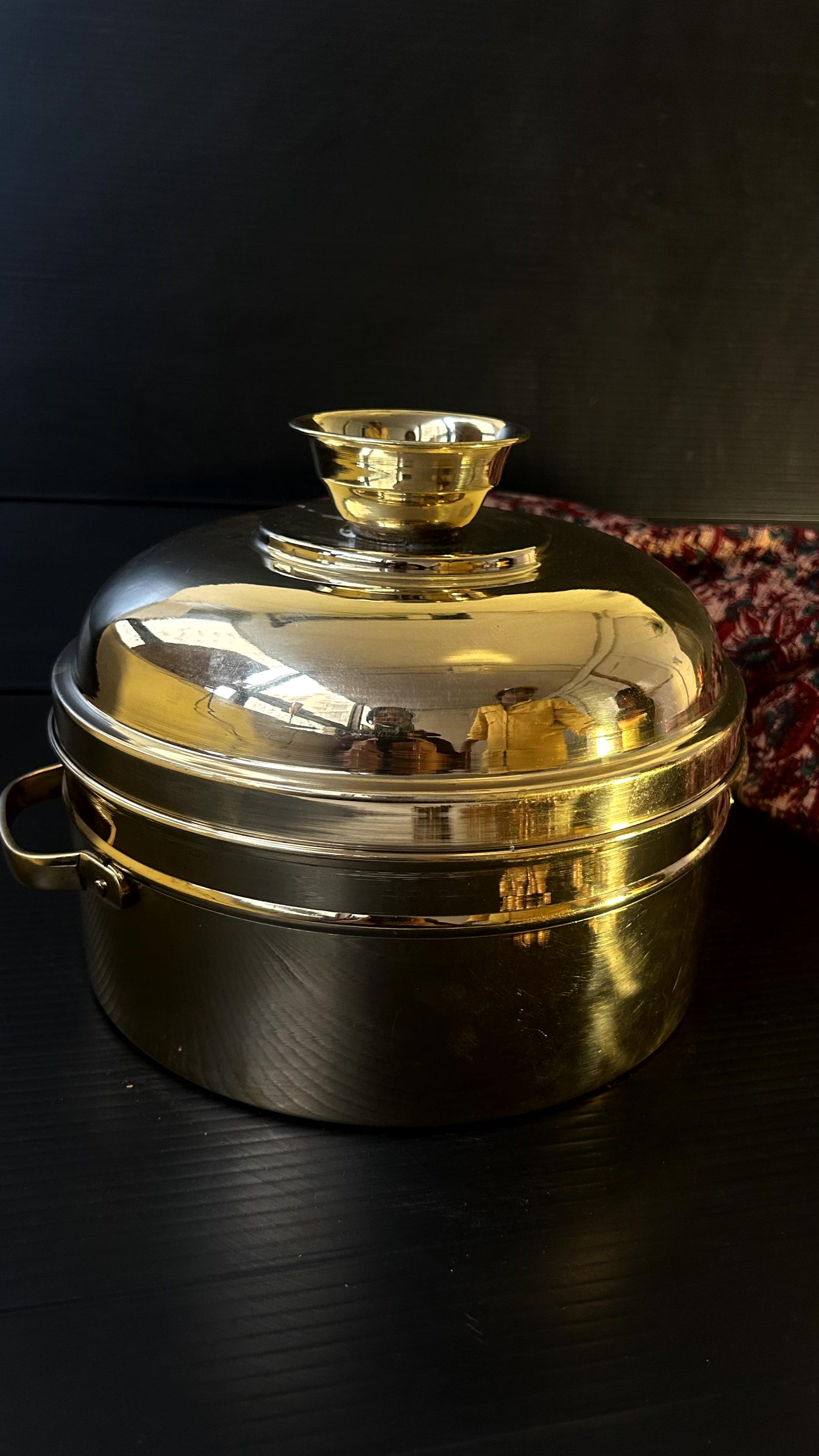 This beautiful brass steamer, is called modak patra, in Marathi. Modaks are vegetarian steamed dumplings, filled with melt in the mouth mixture of jaggery/sugar, fresh grated coconut and wrapped in rice flour dough.They are steamed in this special modak patra and eaten with hot ghee poured over them This modak patra is crafted from brass and is hand-hammered The plate where the modak or food items are kept is tin lined so as to make it safe for all types of food The Modak Patra is a quintessential utensil in the Maharashtrian and South Indian kitchen. This quintessential utensil comes in handy especially during the festive season as modak is a staple sweet dish during Ganesh Festival It really is a piece of usable art, that would give immense pleasure to handle and cook with.