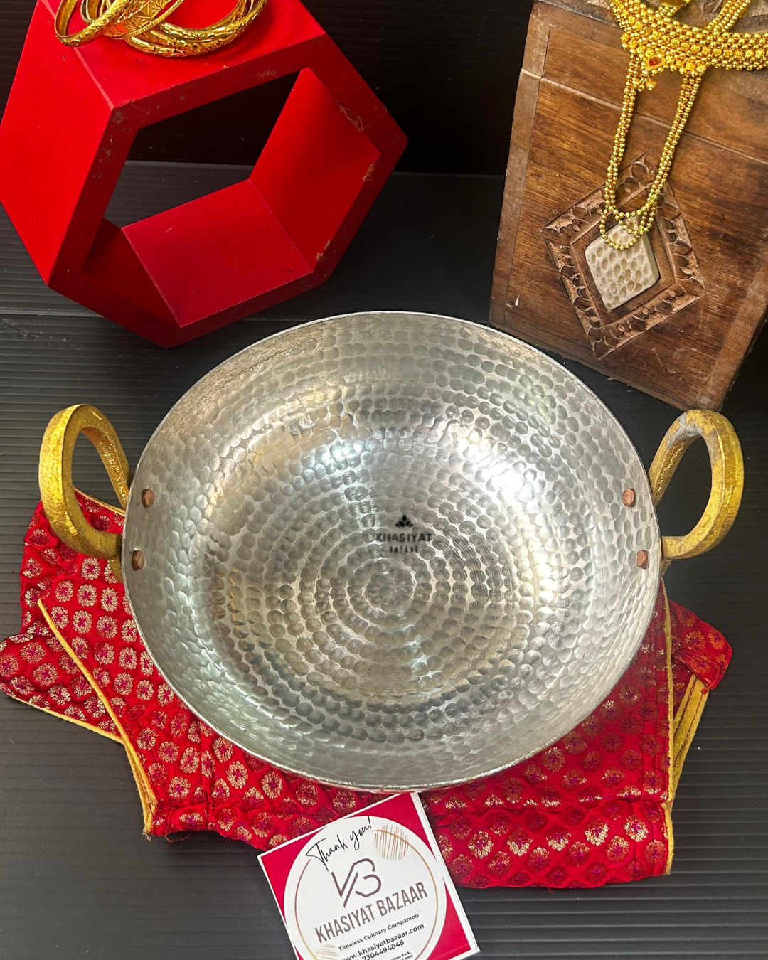 Pital kadai with kalai (tin lining) is a highly recommended utensil by Ayurveda for cooking food and many modern researches have endorsed the results. This Pital kadai is made with best quality Pital and lined with best quality tin, because it is tin lined it is not only safe for all types of food but it also lends additional health benefits of tin, a double bonanza! Khasiyat Bazaar has made such Pital utensils to buy online for everyone! This kadai needs to be tin lined again when the tin lining erodes. When the shining silver layer on the Pital base erodes the Pital base beneath becomes visible. This is an indication that the Pital kadai needs to be tin lined again.