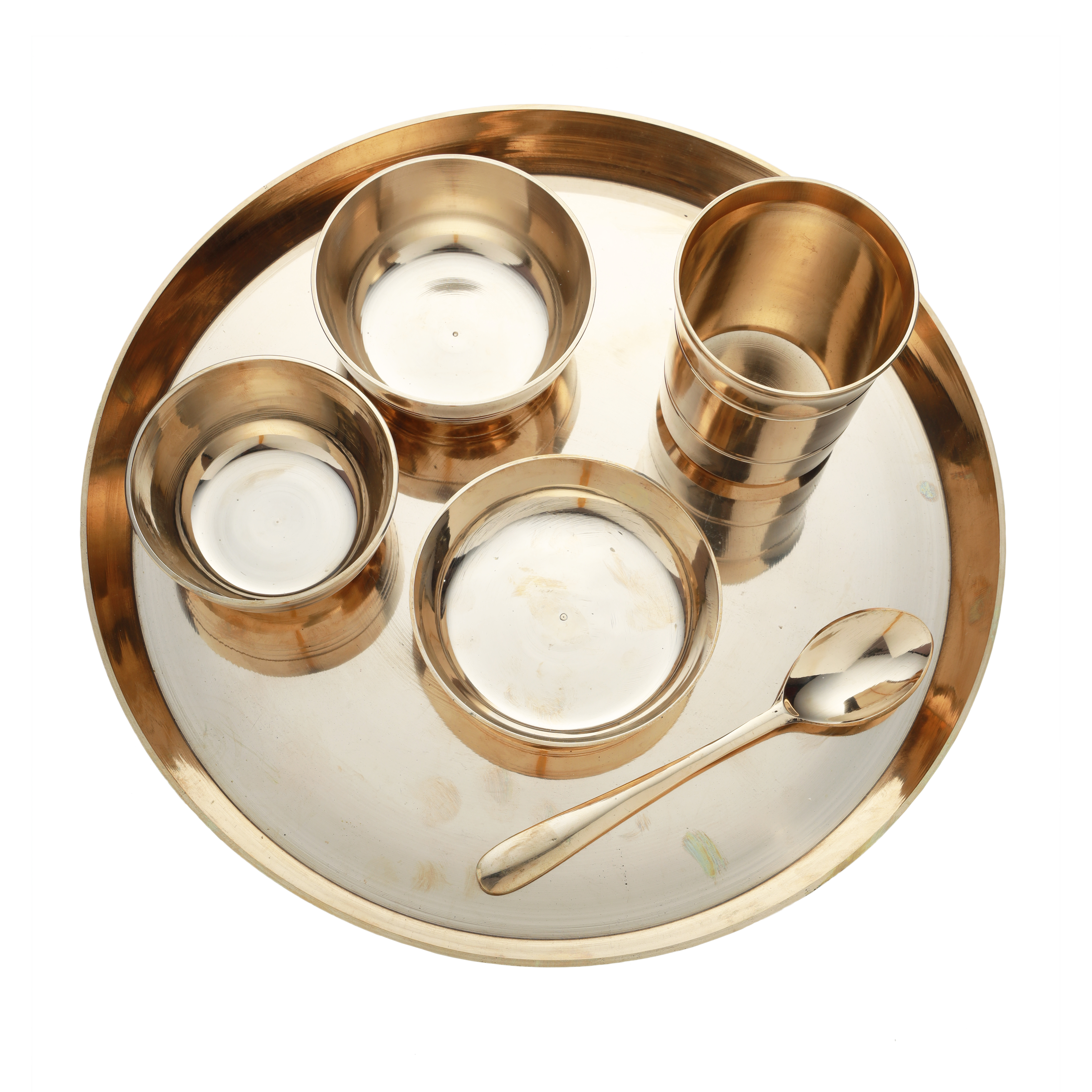 A lifestyle and utilitarian Kansa object, beautifully simple, this bronze thali dinner set is perfect for serving any liquid or dry food.The only condition that you must remember here is keeping from serving sour food in bronze vessels as they react with the metal making the dish toxic and harmful to the human body Anything cooked in a bronze vessel ensures the nutrition of food to be destroyed by no more than three percent. Kansa or Bronze ages beautifully and is an ideal decor. This also makes a wonderful gift for your loved ones.