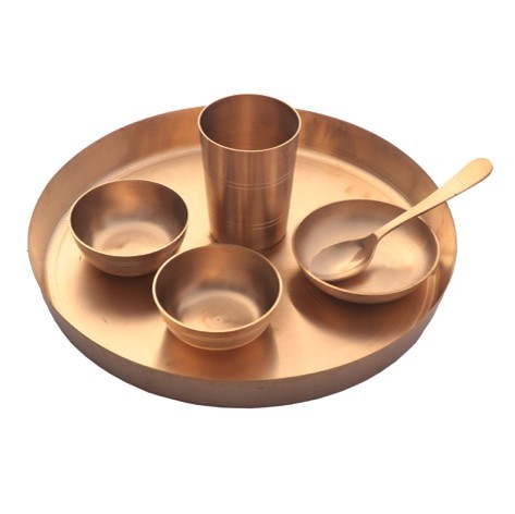 A lifestyle and utilitarian Kansa object, beautifully simple, this bronze thali dinner set is perfect for serving any liquid or dry food. The only condition that you must remember here is keeping from serving sour food in bronze vessels as they react with the metal making the dish toxic and harmful to the human body Anything cooked in a bronze vessel ensures the nutrition of food to be destroyed by no more than three percent. Kansa or Bronze ages beautifully and is an ideal decor. This also makes a wonderful gift for your loved ones.